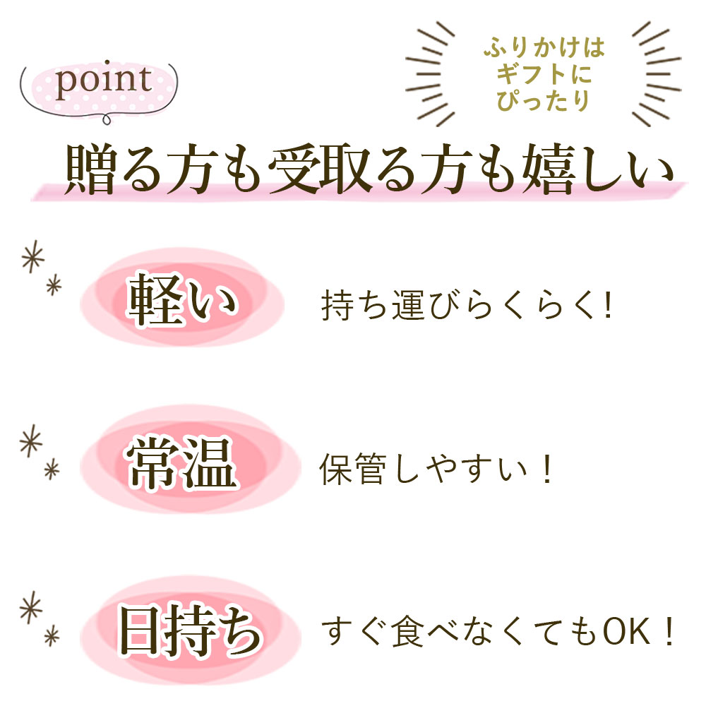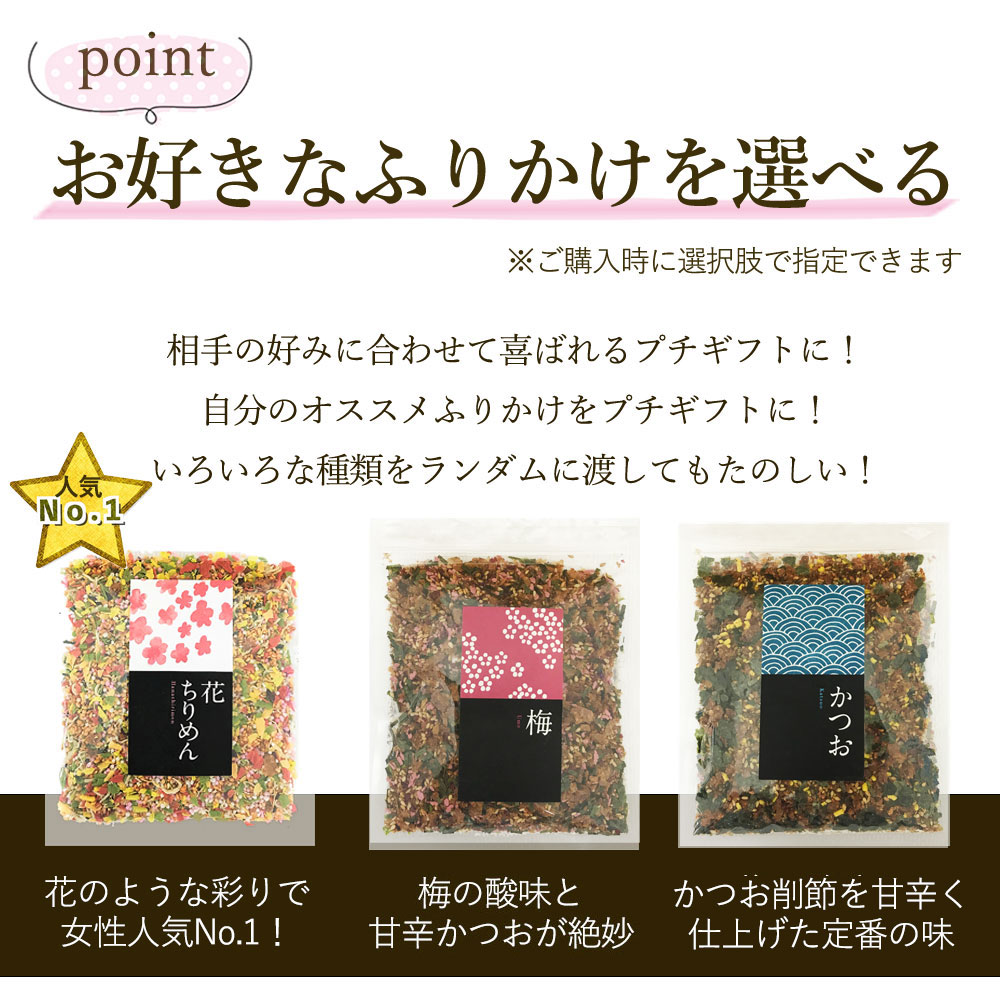 結婚式のプチギフトで購入させていただきました。写真に掲載ある通り可愛いパッケージで味もたくさん選べたので、買う前からテンション上がってました。味を4種類購入しましたが、きちんと判別できるように小さいシールが貼ってありとても助かりました。また梱包も丁寧で工場の方の気配りが感じられ嬉しかったです。 披露宴参加者からは見た目が可愛いとか美味しかったとか好評価でしたので、大満足でした* 関東在住でこちらのふりかけを食べたことなかったのですが、とても美味しかったので今後も定期的に購入させて頂こうと思います。 本当にありがとうございました(’’*)