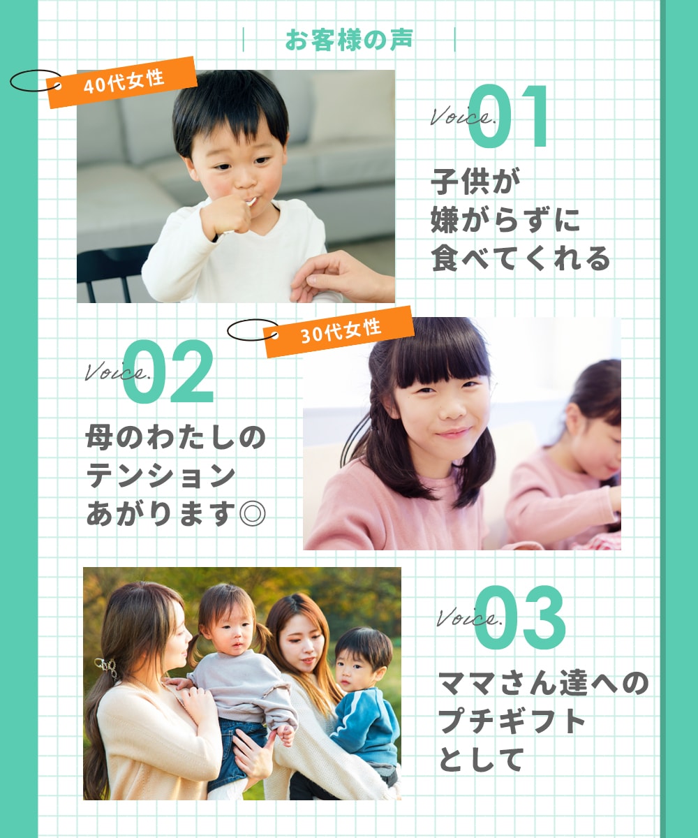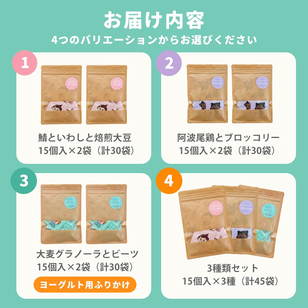 | 原材料名 | ■鯖といわしと焙煎大豆 削節(さば、いわし)(国産)、大豆、きび砂糖、玄米粉、乾燥ほうれん草(ほうれん草、ブドウ糖)、たまりしょうゆ、食塩、オリゴ糖、みりん、米麹、モロヘイヤ粉末、乳酸菌粉末(殺菌)、(一部にさば・大豆を含む) ■阿波尾鶏とブロッコリー 鶏削節(国産)、大豆、白ごま、玄米粉、きび砂糖、チキンエキス、塩麹、オリゴ 糖、玉ねぎ粉末、米麹、ブロッコリー粉末、モロヘイヤ粉末、乳酸菌粉末(殺菌)、 (一部に大豆、鶏肉を含む) ■大麦グラノーラとビーツ 大麦グラノーラ(大麦(九州産)、黒糖蜜、米油)、てんさい糖、黒糖粉末、玄米粉、 ビーツ粉末、オリゴ糖、乾燥ラズベリー、米麹、モロヘイヤ粉末、乳酸菌粉末(殺 菌) |
